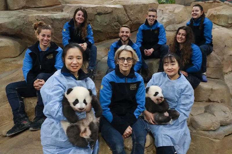 Les soigneurs de Beauval tenant les bébés pandas dans leurs bras.